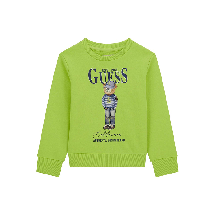 Салатовый джемпер Guess – это идеальный выбор для вашего юного модника! Изготовленный из 100% хлопка, он украшен очаровательным принтом с медведем в полосатой футболке и джинсах, а также надписью Guess. Нежный салатовый цвет придает джемперу легкость и яркость, а стильный принт делает его незаменимым в гардеробе вашего ребенка. На фотографиях видна аккуратная детализация принта и мягкая текстура ткани. Качество от американского бренда Guess и внимание к деталям делают этот джемпер отличным выбором для вашего малыша!