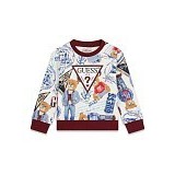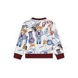 Яркий джемпер GUESS с забавным принтом – идеальный выбор для модного малыша! На белой основе изображены милые медвежата в джинсовых куртках, флаги и фирменный логотип бренда. Бордовые манжеты и горловина добавляют образу стильный акцент. Изготовлен из 100% хлопка – мягкий, дышащий и гипоаллергенный материал для активной игры. Премиальное качество от американского бренда.