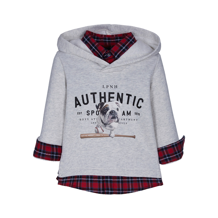 Джемпер Lapin House – это идеальный выбор для вашего юного спортивного героя! Изготовлен из высококачественного 98% хлопка и 2% полиамида, он украшен принтом собаки и бейсбола. Нежная серая основа с ярким принтом создает спортивный и модный образ. На фотографии видна аккуратная красная окантовка по краю и мягкая текстура ткани. Качество от бренда из Греции и внимание к деталям делают этот джемпер отличным выбором для вашего малыша!