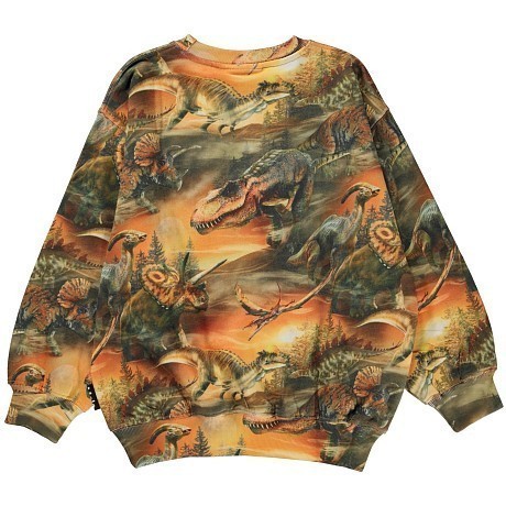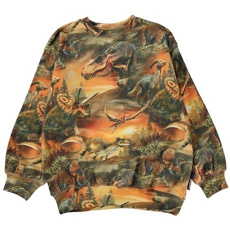 Джемпер Molo – это идеальный выбор для юных динозаврофилов! Изготовленный из 100% натурального хлопка, он украшен ярким принтом с разнообразными динозаврами в динозавровом парке. На передней и задней части джемпера изображены различные виды динозавров, летающие птеродактили и пейзаж с горами и деревьями. Нежная текстура ткани и удобная посадка делают этот джемпер комфортным для вашего ребенка. На фотографиях видна аккуратная окантовка по краю и мягкая текстура ткани. Качество от бренда из Дании и внимание к деталям делают эту модель отличным выбором для вашего мальчика!