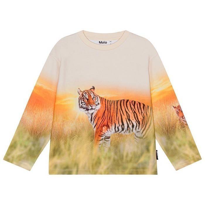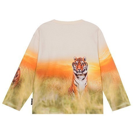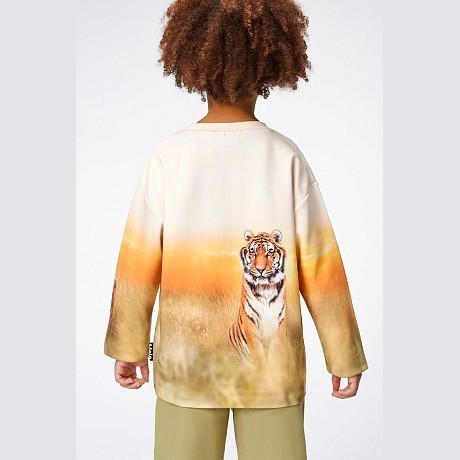 Джемпер Molo – это идеальный выбор для вашего юного модника! Изготовленный из 100% натурального хлопка, он украшен ярким принтом с тиграми и закатом. Нежная текстура ткани и удобная посадка создают комфорт и уют. На фотографиях видна аккуратная окантовка по краю и мягкая текстура ткани. Качество от бренда из Дании и внимание к деталям делают этот джемпер отличным выбором для вашего ребенка!