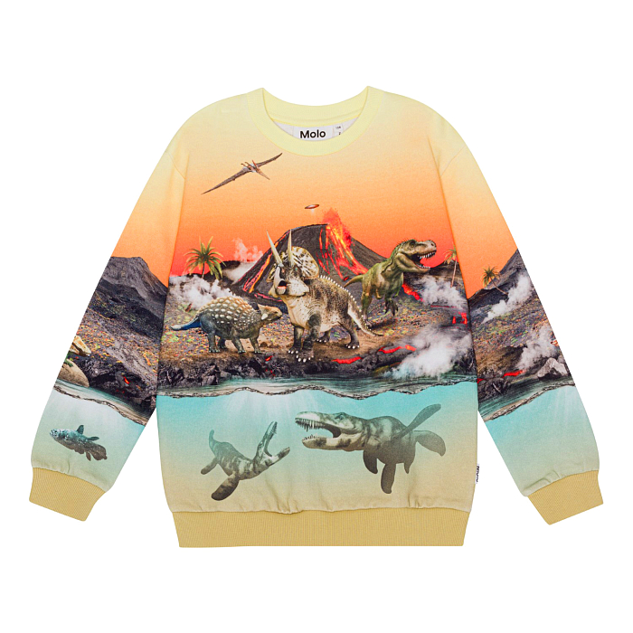 Джемпер Molo – это идеальный выбор для юных динозавров! Изготовленный из 100% натурального хлопка, он украшен ярким принтом с динозаврами, вулканом и летающими динозаврами. На передней и задней части джемпера изображены различные виды динозавров, летающие динозавры и вулкан, извергающий лаву. Нежная текстура ткани и удобная посадка делают этот джемпер отличным выбором для вашего ребенка!