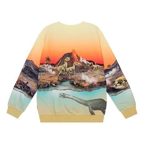 Джемпер Molo – это идеальный выбор для юных динозавров! Изготовленный из 100% натурального хлопка, он украшен ярким принтом с динозаврами, вулканом и летающими динозаврами. На передней и задней части джемпера изображены различные виды динозавров, летающие динозавры и вулкан, извергающий лаву. Нежная текстура ткани и удобная посадка делают этот джемпер отличным выбором для вашего ребенка!