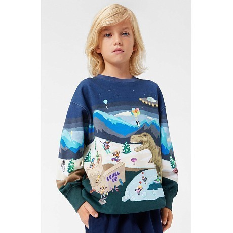 Джемпер для мальчиков темно-синий с принтом динозавров и снежного пейзажа