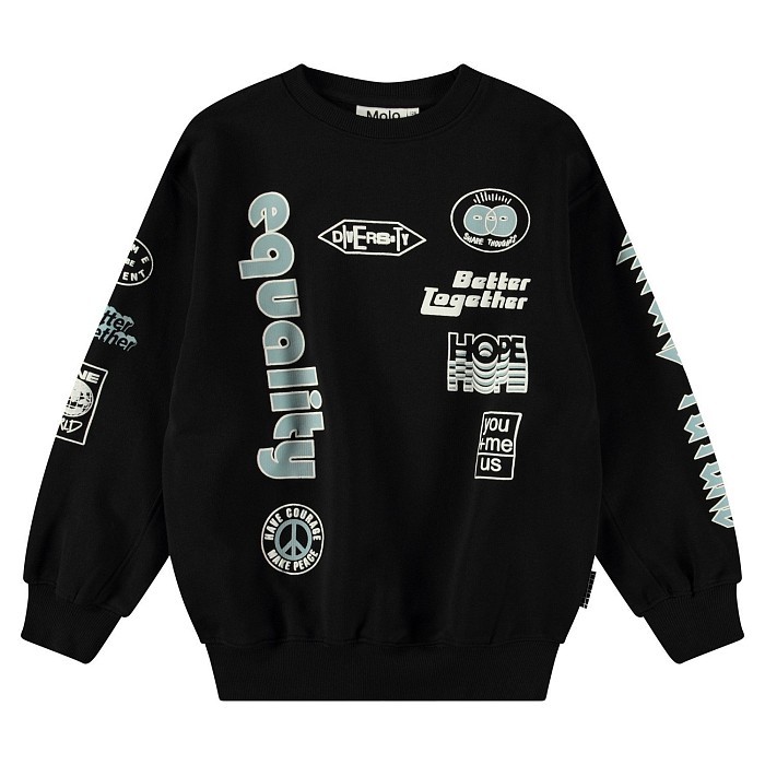 Джемпер для мальчиков Molo – это идеальный выбор для активных детей! Изготовлен из 100% натурального хлопка, он украшен стильными принтами и надписями, которые добавят вашему ребенку уверенности и уверенности в себе. На передней части джемпера видны крупные надписи "equality", "diversity", "better together", "hope", "you me us" и другие мотивирующие фразы. На рукавах также есть интересные принты, такие как "better", "team" и другие. Нежная черная основа с яркими белыми и голубыми акцентами создает модный и современный образ. Качество от датского бренда Molo и внимание к деталям делают этот джемпер отличным выбором для вашего ребенка!