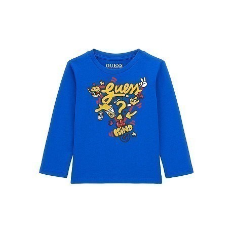 Фуфайка Guess – это идеальный выбор для мальчиков! Изготовленная из 100% хлопка, она украшена ярким принтом с логотипом Guess и различными элементами, такими как гамбургер, конфета, кружок и другие детали. Фуфайка с длинными рукавами и круглым вырезом горловины создает стильный и уютный образ для вашего ребенка. На фотографиях видна аккуратная детализация принта и мягкая текстура ткани. Качество от бренда Guess и внимание к деталям делают эту фуфайку отличным выбором для вашего малыша!