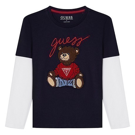 Футболка Guess темно-синего цвета – это идеальный выбор для юных модников! Изготовленная из 100% хлопка, она украшена милым принтом медведя в красной кофте и голубых штанах. Нежная темно-синяя основа с яркими акцентами создает стильный и в то же время уютный образ. На фотографиях видна аккуратная белая окантовка по краю рукавов и мягкая текстура ткани. Качество от бренда из США и внимание к деталям делают эту футболку отличным выбором для вашего ребенка!