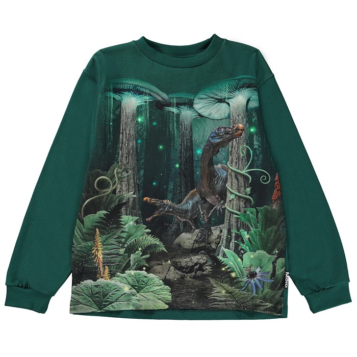 Футболка Molo с длинным рукавом – это идеальный выбор для вашего юного динозаврофилла! Изготовленная из 100% натурального хлопка, она украшена очаровательным принтом с динозаврами и грибами в лесу. Нежная зеленая основа с яркими деталями создает волшебное настроение. На фотографиях видна аккуратная зеленая окантовка по краю и мягкая текстура ткани. Качество от бренда из Дании и внимание к деталям делают эту футболку отличным выбором для вашего малыша!