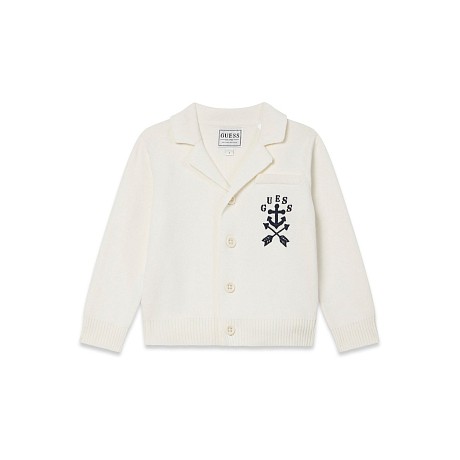 Кардиган Guess – это идеальный вариант для вашего юного модника! Изготовлен из 100% хлопка, он украшен стильным принтом с надписью "GUESS" и двумя перекрещивающимися стрелками. Нежная белая основа с черными элементами создает элегантный и современный образ. На фотографиях видна аккуратная черная окантовка по краю и мягкая текстура ткани. Качество от американского бренда Guess обеспечивает длительную носку и комфорт.