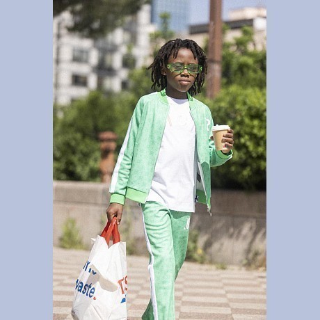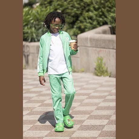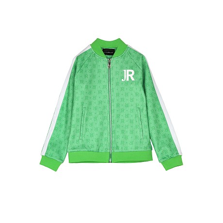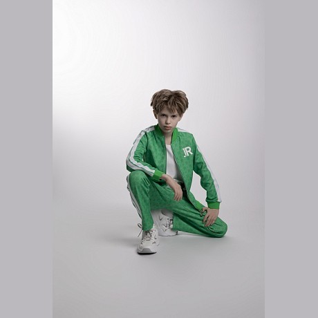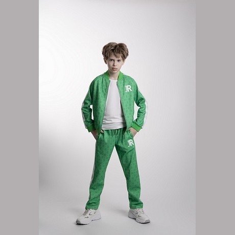 - 🎨 Дизайн: зеленый фон с белыми вставками, белые полосы на рукавах и воротнике, принт с логотипом "JR"