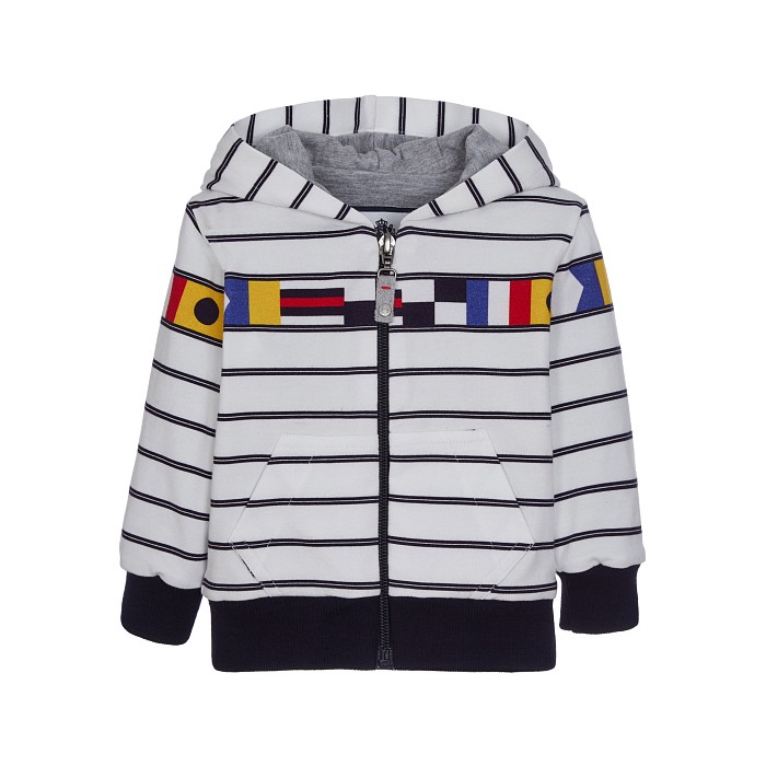 Жакет тр. для мальчиков Lapin House – это идеальный выбор для вашего ребенка! Изготовлен из комфорта 93% хлопка и эластичности 7% эластана, он украшен яркими флагами и черными полосками на белом фоне. Нежная ткань с мягким воротником и удобной застежкой-молнией делают этот жакет идеальным для мальчиков. На фотографиях видны аккуратные флаги и контрастные полоски, а также мягкая подкладка из серого трикотажа. Качество от бренда из Греции и внимание к деталям делают этот жакет отличным выбором для вашего ребенка!