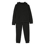 - 🎨 Дизайн: черная толстовка с капюшоном и карманами, черные брюки с эластичными манжетами