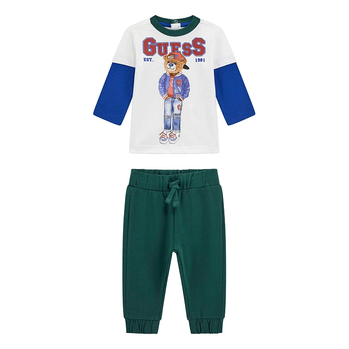 Комплект тренировочный Guess – идеальный выбор для мальчиков! Фуфайка и брюки выполнены из 100% хлопка, обеспечивающего мягкость и комфорт. Фуфайка украшена принтом с милым медведем в кепке и куртке, а также надписью Guess. Брюки дополнены удобной эластичной резинкой и карманами спереди. Качество от бренда Guess и внимание к деталям делают этот комплект отличным выбором для вашего ребенка!