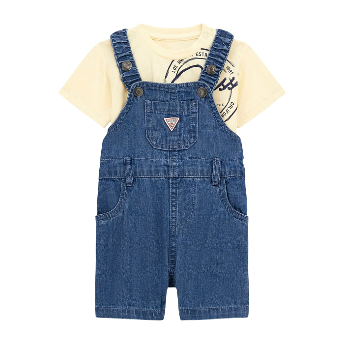 Комплект футболка+комбинезон Guess – идеальный выбор для мальчиков! Изготовлен из 95% хлопка и 5% эластана, он обеспечивает идеальную посадку и комфорт. Комбинезон с карманами спереди и на боках, удобная застежка на кнопки и эластичная резинка на поясе. Футболка с принтом и надписями, дополненная логотипом Guess, создает стильный и модный образ. Качество от бренда Guess и удобная доставка СДЭК по всей России делают этот комплект отличным выбором для вашего ребенка!