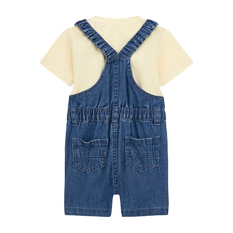 - 🎨 Дизайн: футболка с принтом и надписями, комбинезон с карманами, удобная застежка на кнопки
