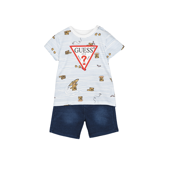 Комплект футболка+шорты Guess – это идеальный выбор для активных мальчиков! Изготовленный из 100% хлопка, он украшен очаровательным принтом с милыми медведями, игрушками и морскими волнами на белом фоне. Нежная белая футболка с короткими рукавами и удобными шортами из джинсовой ткани создают идеальный образ для игр и прогулок. На фотографиях видна аккуратная белая окантовка по краю и мягкая текстура ткани. Качество от бренда из США и внимание к деталям делают этот комплект отличным выбором для вашего мальчика!