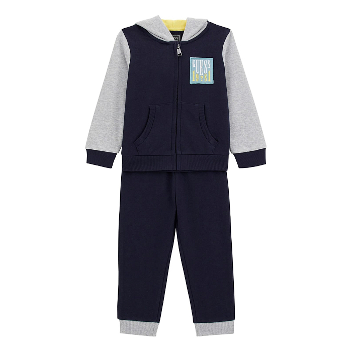 Комплект тренировочный Guess для мальчиков – идеальный выбор для вашего ребенка! Кардиган и брюки выполнены из 100% хлопка, что обеспечивает мягкость и комфорт при носке. Стильный дизайн с логотипом Guess подчеркивает индивидуальность вашего ребенка. Кардиган с капюшоном и карманами, а также брюки с удобными карманами и эластичным поясом создают идеальную посадку. На фотографиях видна удобная посадка, стильный логотип Guess и качественная ткань. Качество от американского бренда Guess и внимание к деталям делают этот комплект отличным выбором для вашего активного мальчика!