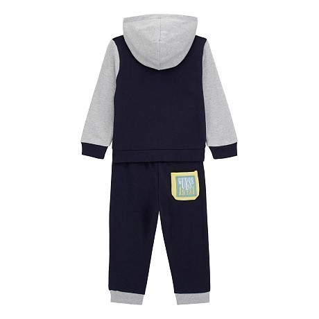 Комплект тренировочный Guess для мальчиков – идеальный выбор для вашего ребенка! Кардиган и брюки выполнены из 100% хлопка, что обеспечивает мягкость и комфорт при носке. Стильный дизайн с логотипом Guess подчеркивает индивидуальность вашего ребенка. Кардиган с капюшоном и карманами, а также брюки с удобными карманами и эластичным поясом создают идеальную посадку. На фотографиях видна удобная посадка, стильный логотип Guess и качественная ткань. Качество от американского бренда Guess и внимание к деталям делают этот комплект отличным выбором для вашего активного мальчика!