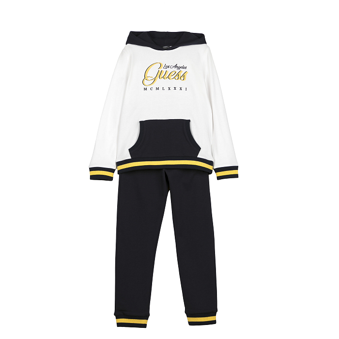 Комплект тр. (толстовка+брюки) Guess – идеальный выбор для мальчиков от 7 до 12 лет! Изготовлен из 100% хлопка, он оформлен стильным логотипом Guess и контрастными желто-черными вставками. Белая основа с черными брюками и желтыми вставками создает модный и элегантный образ. На фотографиях видна аккуратная вышивка логотипа и мягкая текстура ткани. Качество от американского бренда Guess и внимание к деталям делают этот комплект отличным выбором для вашего ребенка!