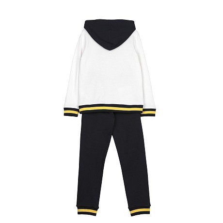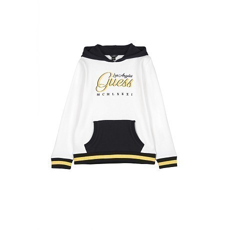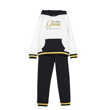 Комплект тр. (толстовка+брюки) Guess – идеальный выбор для мальчиков от 7 до 12 лет! Изготовлен из 100% хлопка, он оформлен стильным логотипом Guess и контрастными желто-черными вставками. Белая основа с черными брюками и желтыми вставками создает модный и элегантный образ. На фотографиях видна аккуратная вышивка логотипа и мягкая текстура ткани. Качество от американского бренда Guess и внимание к деталям делают этот комплект отличным выбором для вашего ребенка!