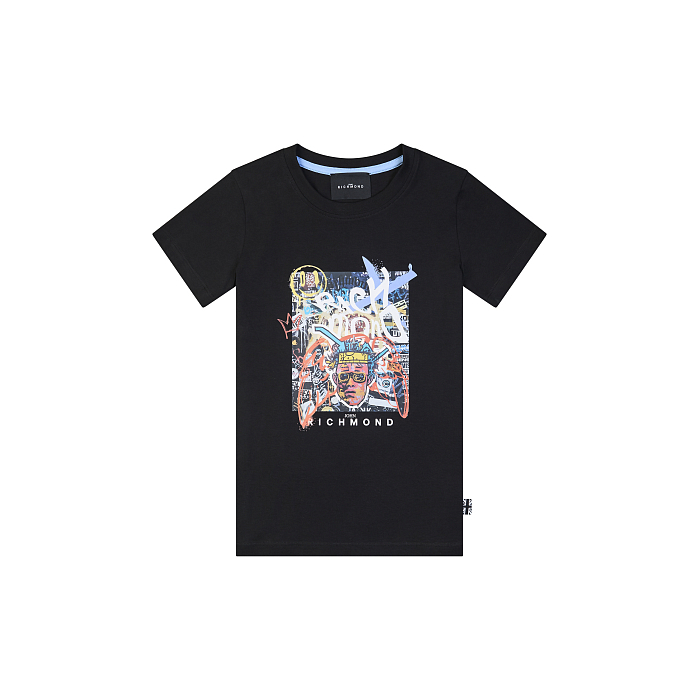 Футболка John Richmond – это идеальный вариант для мальчиков! Изготовленная из 100% хлопка, она украшена ярким графическим принтом с изображением человека в очках и кепке, а также разноцветными линиями и надписями. Черный фон подчеркивает контраст и делает футболку особенно стильной. На изображениях видна аккуратная голубая окантовка по краю и мягкая текстура ткани. Качество от бренда из Великобритании и внимание к деталям делают эту футболку отличным выбором для вашего ребенка!