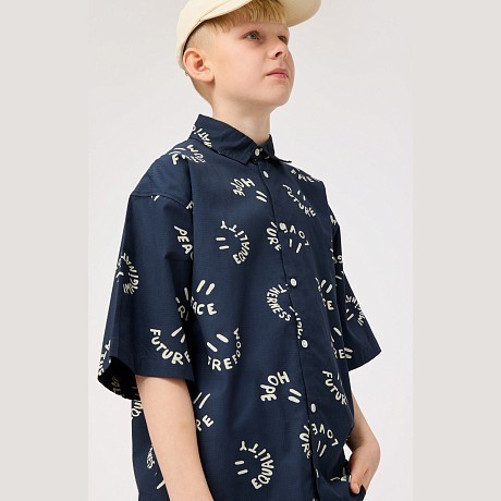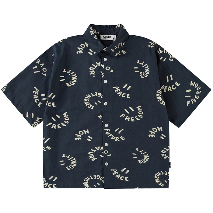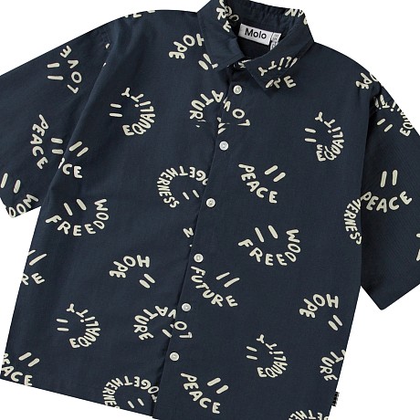 Рубашка Molo черного цвета с принтом слов "Peace", "Love", "Equality" и "Future" – это идеальный выбор для вашего юного модника! Изготовлена из 100% натурального хлопка, она создает комфорт и стиль. Принт слов на черном фоне делает рубашку необычной и запоминающейся. На фотографиях видна аккуратная белая контрастная надпись по всему телу рубашки. Качество от бренда из Дании и внимание к деталям делают эту рубашку отличным выбором для вашего мальчика!