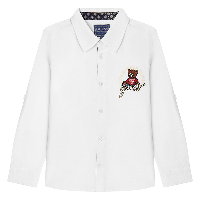 Рубашка Guess – это идеальный выбор для детей от 3 до 6 лет! Изготовленная из 100% хлопка, она украшена милым принтом медведя в красной куртке и логотипом Guess. Белая основа с красными акцентами создает классический и модный образ. На фотографиях видна аккуратная белая окантовка по краю и удобная застежка на пуговицы. Качество от американского бренда Guess и внимание к деталям делают эту рубашку отличным выбором для вашего мальчика!