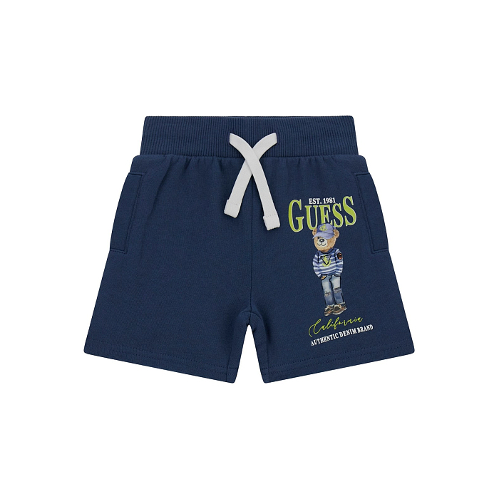 Шорты Guess – это идеальный выбор для активных мальчиков! Изготовленные из 100% хлопка, они украшены стильным принтом с медведем в кепке и кроссовках. Темно-синий цвет подчеркивает модный образ вашего ребенка. На фотографиях видна удобная эластичная резинка пояса и мягкая текстура ткани. Качество от американского бренда Guess и внимание к деталям делают эти шорты отличным выбором для вашего мальчика!