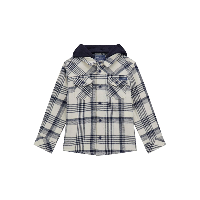 Рубашка Guess – это идеальный выбор для мальчиков от 3 до 6 лет! Изготовленная из 100% хлопка, она украшена элегантной клетчатой расцветкой в молочном цвете. Капюшон синего цвета и удобные карманы с клапанами создают стильный и практичный образ. На фотографиях видна аккуратная клетчатая текстура ткани, удобная застежка на пуговицы и мягкая подкладка. Качество от бренда из США и внимание к деталям делают эту рубашку отличным выбором для вашего ребенка!