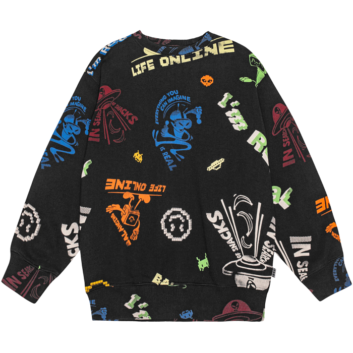 Джемпер Molo – это идеальный выбор для вашего юного модника! Изготовлен из 100% натурального хлопка, он украшен ярким принтом Life Online с разноцветными надписями и мультяшными изображениями. Черный фон с яркими элементами создает модный и в то же время комфортный наряд. На фотографиях видны различные элементы дизайна: надписи, изображения космических кораблей, улиток, иконки и другие детали. Качество от датского бренда и внимание к деталям делают этот джемпер отличным выбором для вашего ребенка!