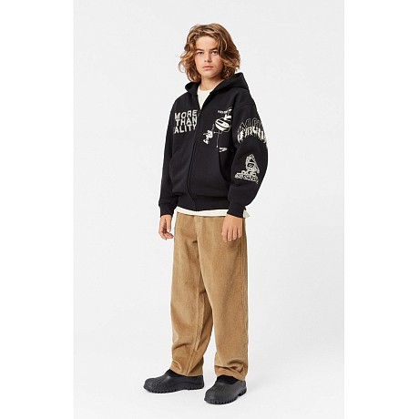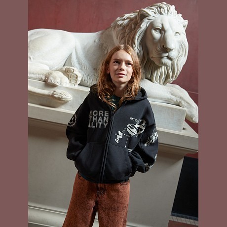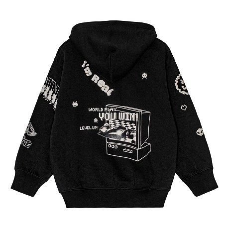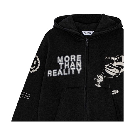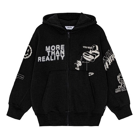 Толстовка Molo – это идеальный выбор для юных геймеров! Изготовленная из комфорта 80% хлопка и 20% полиэстера, она украшена оригинальным принтом More Than Reality и игровыми мотивами. На передней части видна надпись "More Than Reality" и изображение игровой консоли с надписью "You Win!". На рукавах и спине также размещены интересные детали, такие как "I'm Real" и "Level Up!". Нежная черная основа с белыми акцентами создает современный и в то же время уютный образ. Качество от бренда из Дании и внимание к деталям делают эту толстовку отличным выбором для вашего ребенка!