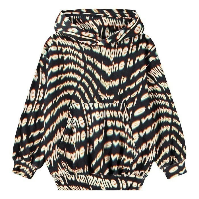 Толстовка Molo – это идеальный выбор для мальчиков! Изготовленная из 100% натурального хлопка, она украшена ярким принтом 'Everything you can imagine is real'. Черный фон с белыми и оранжевыми буквами создает современный и стильный образ. На фотографиях видна удобная посадка, мягкая текстура ткани и комфортная эластичная резинка по низу. Качество от бренда из Дании и внимание к деталям делают эту толстовку отличным выбором для вашего ребенка!
