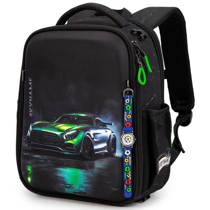 Рюкзак SkyName – это идеальный выбор для мальчиков всех возрастов! Изготовленный из прочного 100% полиэстера, он украшен ярким принтом спортивного автомобиля с зелеными и красными акцентами. Черный цвет подчеркивает элегантность, а дополнительные часы и мешок для обуви делают его не только удобным, но и практичным. Быстрая доставка СДЭК по всей России.