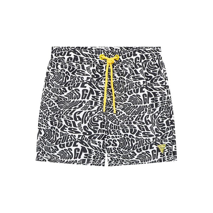 Шорты купальные для мальчиков Guess – это идеальный выбор для летних купаний! Изготовленные из 100% полиэстера с подкладкой из 90% полиэстера и 10% эластана, они обеспечивают комфорт и свободу движений. Шорты черного цвета с ярким принтом логотипа Guess на белом фоне создают стильный и современный образ. На фото видна желтая шнурковая завязка и логотип Guess на поясе. Качество материала и внимание к деталям делают эти шорты отличным выбором для вашего ребенка!