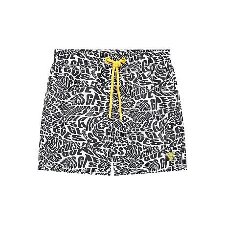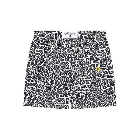 Шорты купальные для мальчиков Guess – это идеальный выбор для летних купаний! Изготовленные из 100% полиэстера с подкладкой из 90% полиэстера и 10% эластана, они обеспечивают комфорт и свободу движений. Шорты черного цвета с ярким принтом логотипа Guess на белом фоне создают стильный и современный образ. На фото видна желтая шнурковая завязка и логотип Guess на поясе. Качество материала и внимание к деталям делают эти шорты отличным выбором для вашего ребенка!