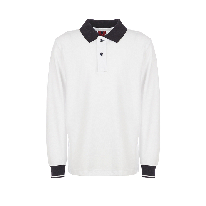 - 🎨 Дизайн: белый цвет, черные вставки на воротнике и манжетах, застежка на кнопку
