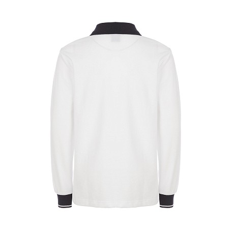 - 🎨 Дизайн: белый цвет, черные вставки на воротнике и манжетах, застежка на кнопку