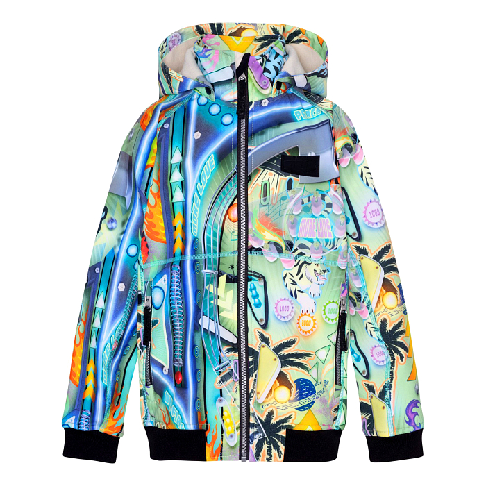 Куртка для мальчиков Molo – это идеальный выбор для активных детей! Изготовленная из 50% переработанного полиэстера и 50% полиэстера, она украшена ярким принтом пинбола с бирюзовым фоном. Куртка с капюшоном и удобной застежкой-молнией создает стильный и комфортный образ. На фотографиях видны детали принта: тигры, пальмы, монеты и другие элементы, которые делают эту куртку необычной и запоминающейся. Качество от бренда из Дании и внимание к деталям делают эту куртку отличным выбором для вашего ребенка!
