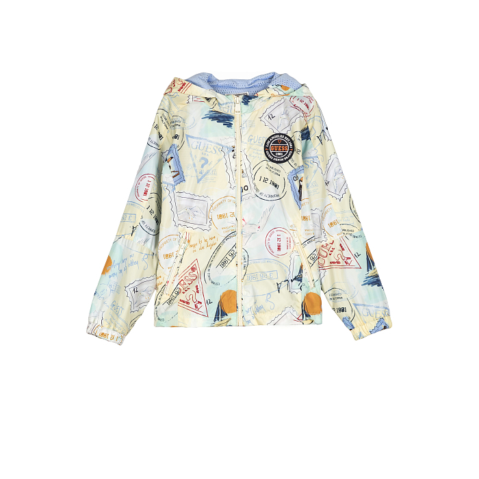 Куртка Guess для мальчиков с ярким принтом почтовых штампов. Изготовлена из 100% полиэстера, что делает ее легкой и удобной в использовании. Оригинальный дизайн, вдохновленный путешествиями, идеально подходит для активных мальчишек. На фото видна удобная молния, мягкая подкладка и стильный капюшон. Куртка Guess - отличный выбор для вашего ребенка!