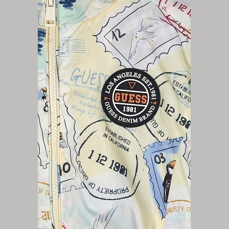 Куртка Guess для мальчиков с ярким принтом почтовых штампов. Изготовлена из 100% полиэстера, что делает ее легкой и удобной в использовании. Оригинальный дизайн, вдохновленный путешествиями, идеально подходит для активных мальчишек. На фото видна удобная молния, мягкая подкладка и стильный капюшон. Куртка Guess - отличный выбор для вашего ребенка!