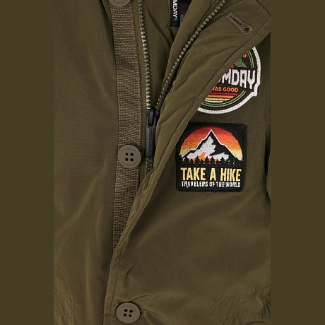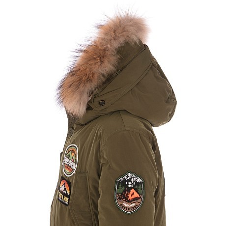 - 🎨 Дизайн: капюшон с мехом, многочисленные эмблемы, мягкая текстура ткани