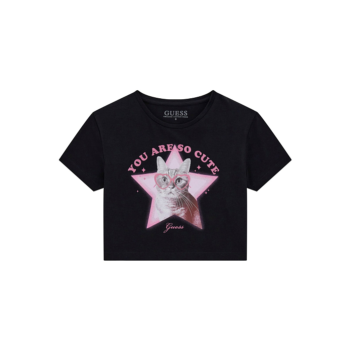 Футболка Guess – это отличный выбор для юных модниц! Изготовлена из качественного хлопка с добавлением эластана, она украшена забавным принтом кота с звездой на черном фоне. Нежная текстура ткани обеспечивает комфорт и удобство при носке. На фотографиях видна аккуратная черная основа с ярким рисунком. Качество от американского бренда Guess делает эту футболку отличным выбором для вашего ребенка!