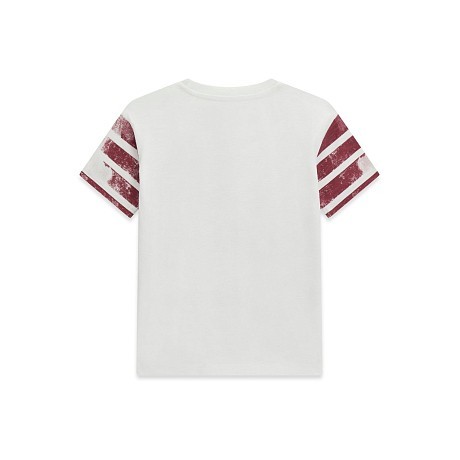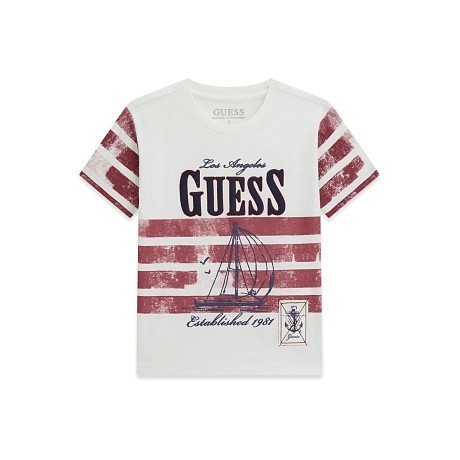 Футболка Guess – это идеальный вариант для мальчиков! Изготовлена из 100% хлопка, она украшена принтом Los Angeles с красными полосами. Нежная белая основа с яркими красными и темно-синими элементами создает стильный и в то же время комфортный образ. На фотографиях видна аккуратная окантовка по краю и мягкая текстура ткани. Качество от американского бренда Guess делает эту футболку отличным выбором для вашего ребенка!