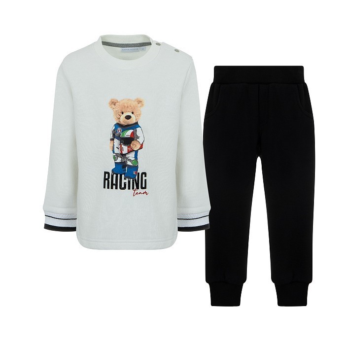 - 🎨 Дизайн: принт медведя в космическом костюме, черная окантовка на рукавах джемпера, эластичная резинка на поясе брюк