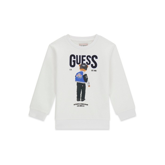 Джемпер Guess – это идеальный выбор для мальчиков! Изготовленный из 100% хлопка, он украшен принтом медведя в кепке и синей футболкой. Модель выполнена в белом цвете, что делает ее универсальной для разных повседневных ситуаций. На фотографиях видна аккуратная белая окантовка по краю и мягкая текстура ткани. Качество от американского бренда Guess обеспечивает длительную носку и комфорт.