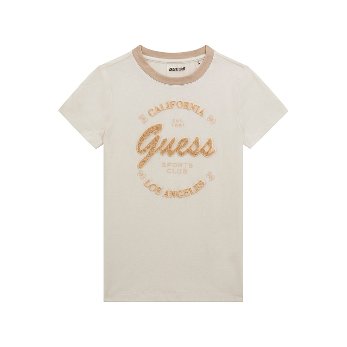 Футболка Guess – идеальный выбор для девочек! Изготовлена из качественного хлопка с добавлением эластана, обеспечивает комфортную посадку. На футболке изображены символы Los Angeles и California, что делает ее не только удобной, но и модной. Нежная белая основа с золотистыми надписями создает неповторимый стильный образ. На фотографиях видна аккуратная окантовка по краю и мягкая текстура ткани. Качество от американского бренда Guess делает эту футболку отличным выбором для вашего ребенка!