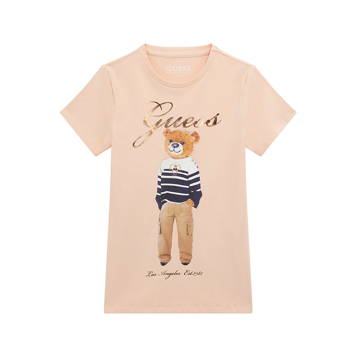 Футболка Guess – это идеальный выбор для маленьких модниц! Изготовленная из комфорта хлопка с добавлением эластана, она украшена очаровательным принтом медведя в полосатой кофте и бежевых шароварах. Милый медведь с золотыми надписями Guess и шармантными черными туфлями на ней создает игривое и в то же время уютное настроение. На фотографиях видна аккуратная окантовка по краю и мягкость ткани. Качество от бренда Guess – премиум качество США и внимание к деталям делают эту футболку отличным выбором для вашего ребенка!