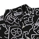 Эта черная рубашка от датского бренда Molo станет хитом гардероба вашего сына! Изготовленная из 100% натурального хлопка, она невероятно мягкая и дышащая. Яркий белый принт с космическими кораблями, планетами и забавными каракулями на черном фоне создает дерзкий и современный образ, идеально подходящий для школы или прогулок. Премиальное качество пошива из Дании гарантирует долговечность и удобство в носке.