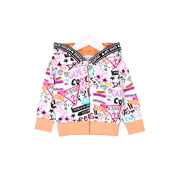 Кардиган Guess – это идеальный выбор для стильных девочек! Изготовленный из 100% хлопка, он украшен ярким принтом с надписями, сердечками, звездочками и другими элементами. Капюшон, мягкая резинка на манжетах и удобная застежка делают эту модель идеальной для повседневной носки. На фотографиях видна яркая расцветка принта с контрастными надписями и символами. Качество от бренда Guess и внимание к деталям делают эту модель отличным выбором для вашего ребенка!