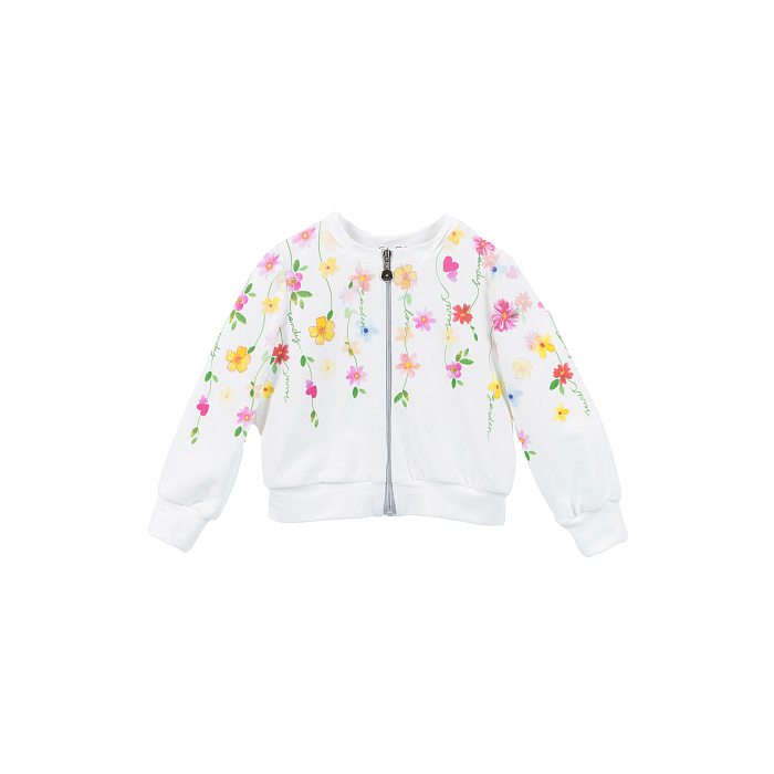 Толстовка Elsy – это идеальный выбор для девочек! Изготовленная из 95% хлопка и 5% эластана, она украшена ярким цветочным принтом на белом фоне. Тонкие цветы, листья и сердечки создают нежный и веселый образ. На фотографиях видна аккуратная застежка на молнии и мягкая текстура ткани. Качество от бренда из Италии и внимание к деталям делают эту толстовку отличным выбором для вашего ребенка!